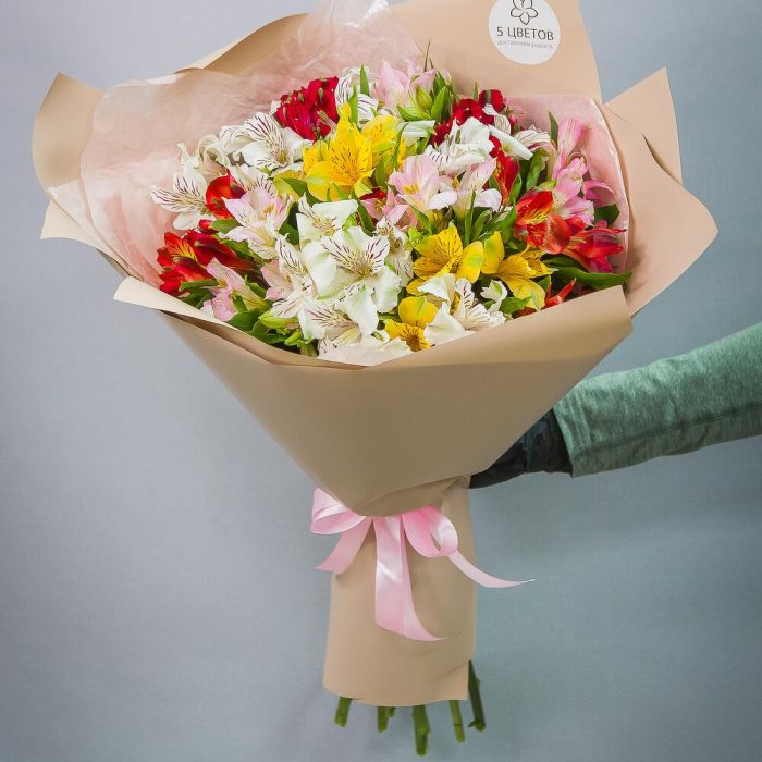 Альстромерия белая – 5 шт.Альстромерия розовая – 5 шт.Альстромерия красная – 5 шт.Упаковка крафт – 1 шт.Атласная лента – 1 шт.