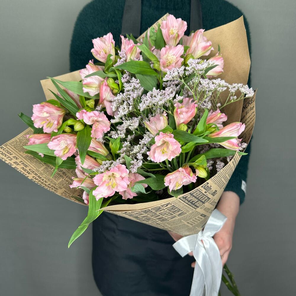 Альстромерия – 5 шт.Лимониум – 2 шт.Лента атласная – 1 шт.Упаковка дизайнерская – 1 шт.