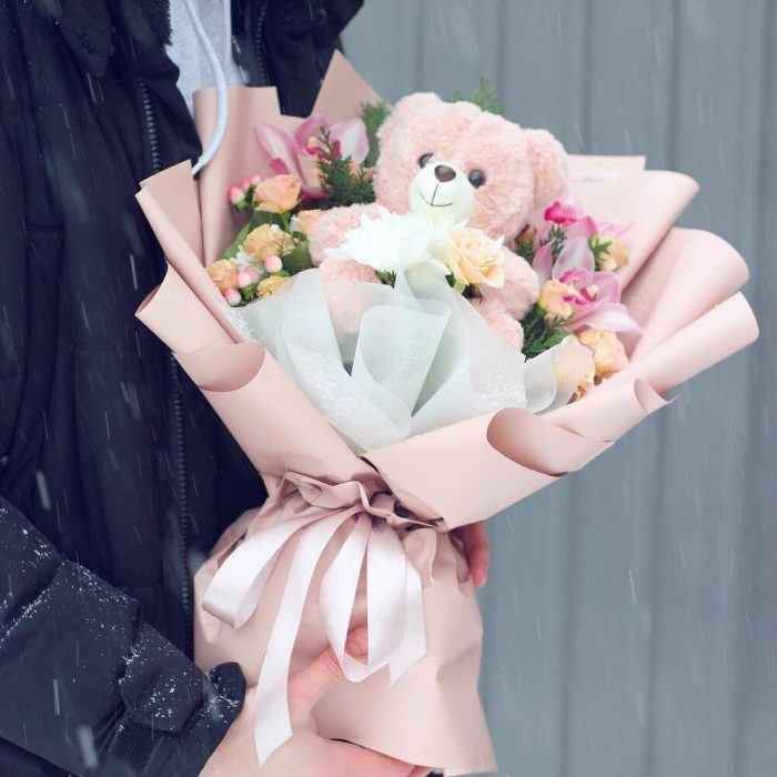“Букет з Ведмежа” – під назвою “Елегантне втілення розкоші”. Цей неперевершений композиційний шедевр- букет, поєднує в собі пристрасні троянди, які втілюють силу кохання та вогненну пристрасть. Вони гармонійно переплітаються з ніжними квітами екзотичних орхідей, створюючи атмосферу розкіші та вишуканості. Кожна квітка букету вибрана з особливою увагою до деталей, а зелені акценти додають композиції неповторності та шарму. Цей букет виражає найвищий рівень стилю і буде вражати навіть найвимогливіших покупців своєю неперевершеною красою.