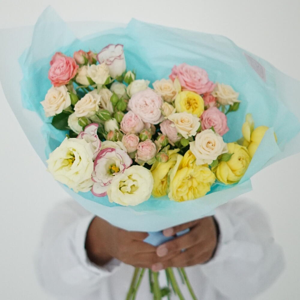 peony spray rose – 7 шт. Lisianthus – 3 шт. gift message card – 1 шт. packaging design – 2 шт. care instruction – 1 шт. free delivery – 1 шт.