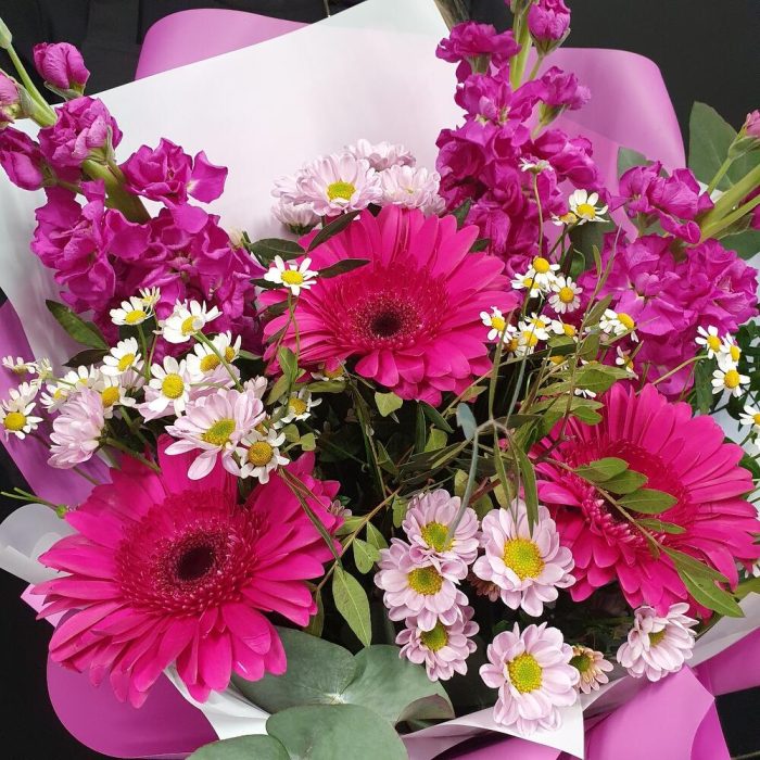 Маттиола – 3 шт.Матрикария – 2 шт.Сантини – 3 шт.Гербера – 3 шт.Фисташка – 3 шт.Эвкалипт – 3 шт.Упаковка дизайнерская – 1 шт.