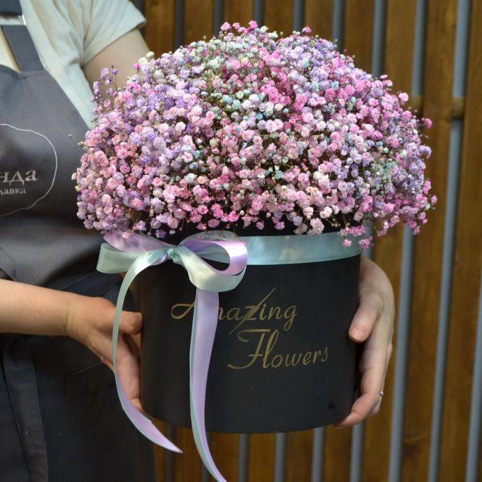 Букет гипсофилы в черной шляпной коробке
