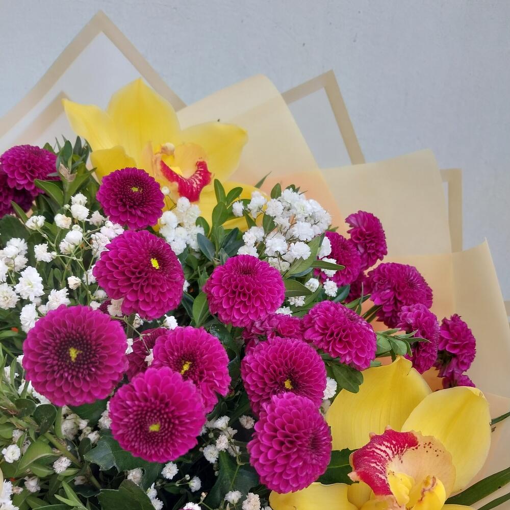 Гипсофила – 1 шт.Сантини – 5 шт.ЦИМБИДИУМ – 3 шт.Упаковка дизайнерская – 8 шт.самшит зелень – 10 шт.