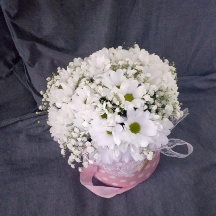 Ромашки с гипсофилой в шляпной коробке