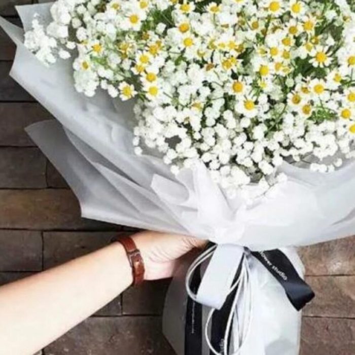 ромашки – 11 шт.Гипсофила – 10 шт.Упаковка дизайнерская – 1 шт.Лента атласная – 2 шт.Пакет подарочный – 1 шт.