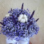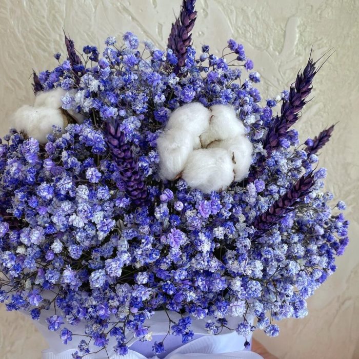 Гипсофила – 7 шт. Хлопок – 3 шт. Коробка шляпная – 1 шт. Пшеница – 11 шт. Оазис флористический – 1 шт.