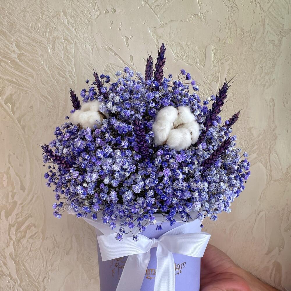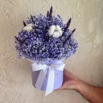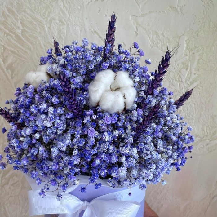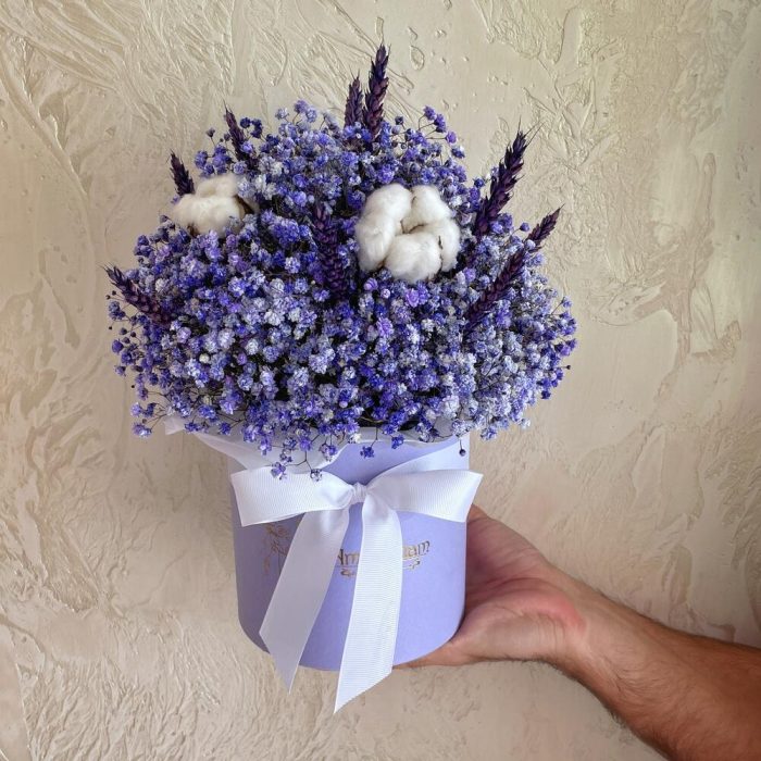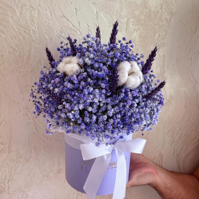 “Сиреневый туман” – композиция из гипсофилы в шляпной коробке