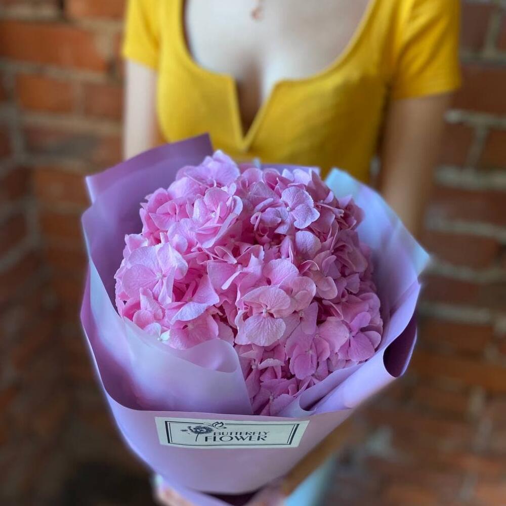 Пышная и яркая шапка нежно-розовой гортензии – идеальный подарок и ключик к самому неприступному сердцу, ведь этот цветок, так напоминает нам о теплых и солнечных летних деньках.