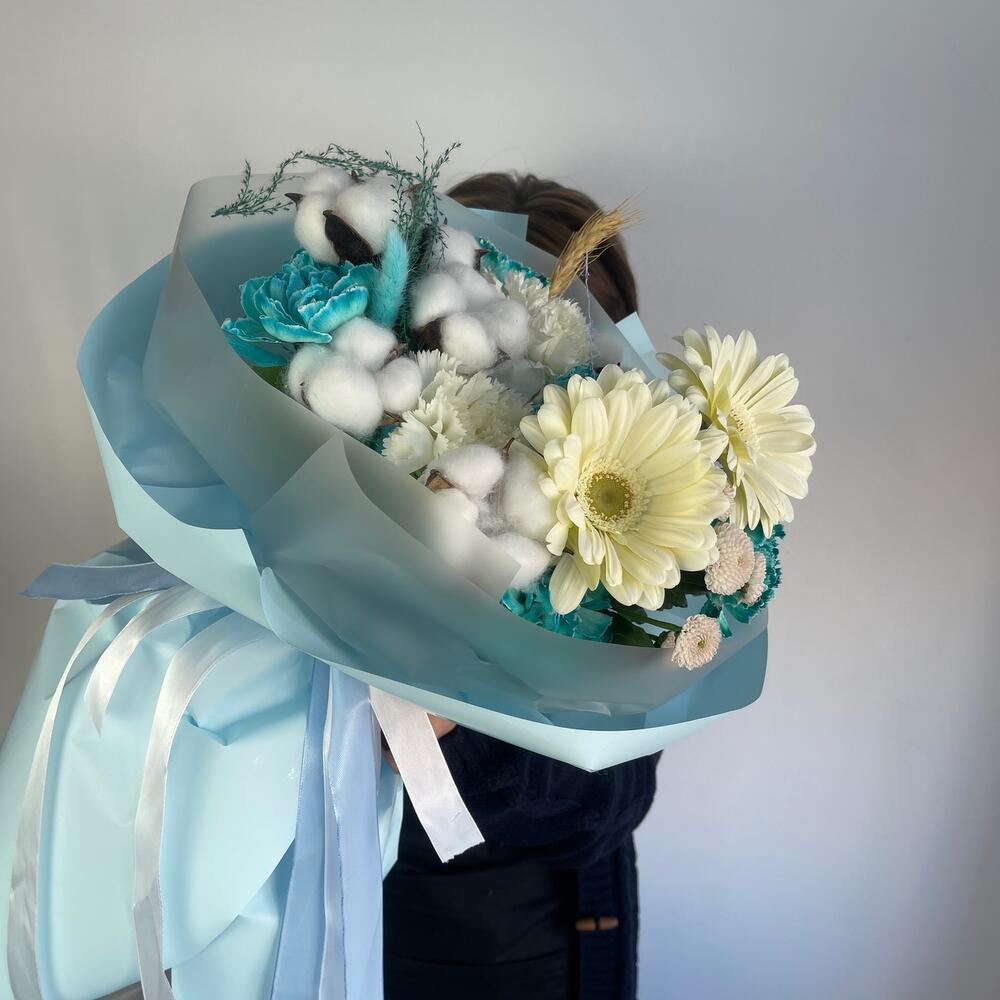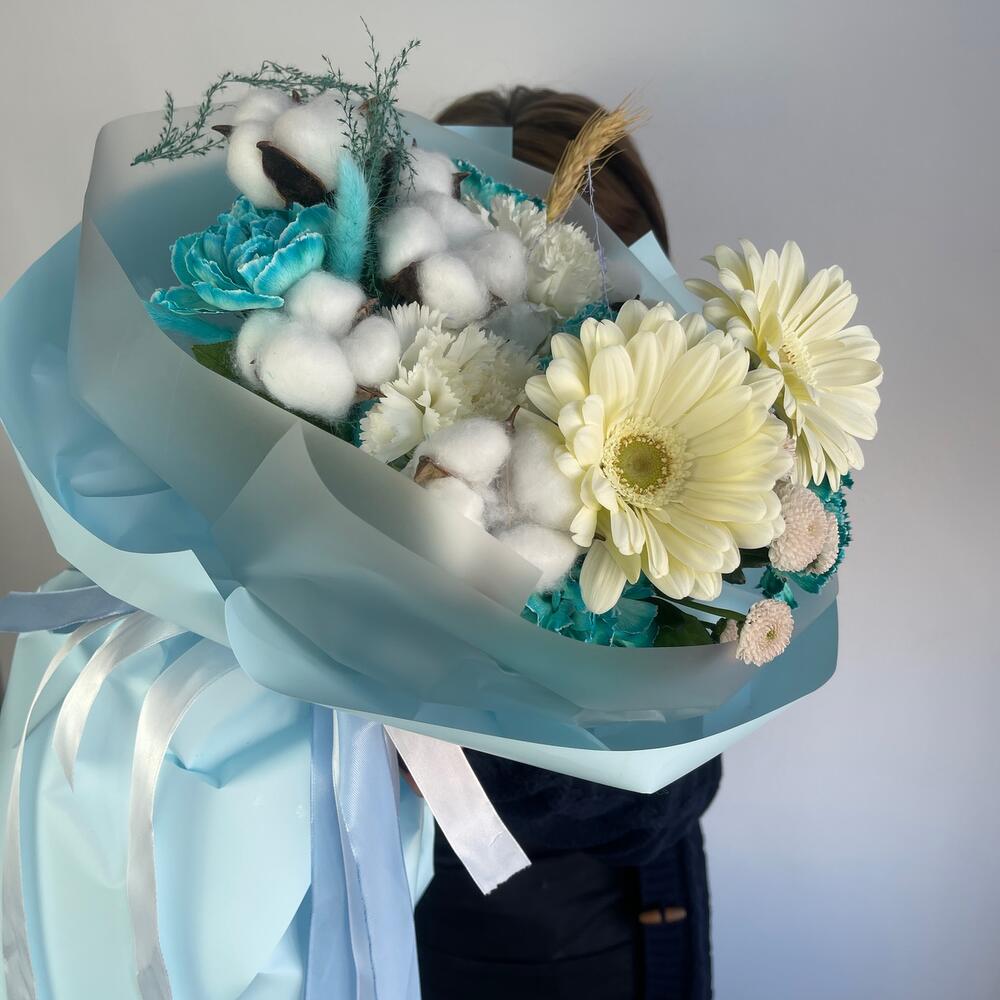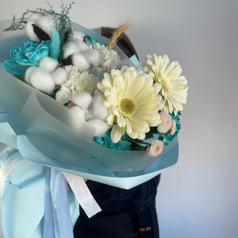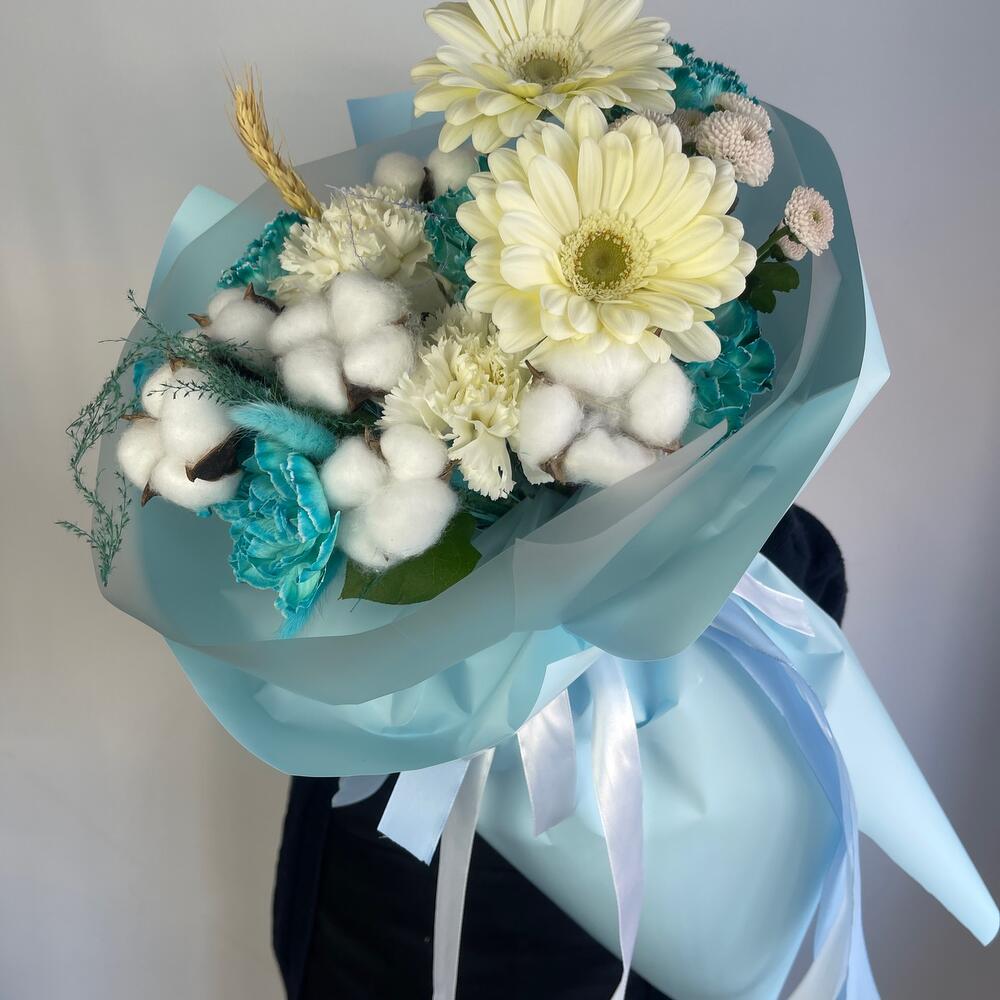 Гербера – 2 шт.Диантус – 8 шт.Хлопок натуральный – 6 шт.Салал пучок – 1 шт.Колосок – 1 шт.Пленка – 6 шт.