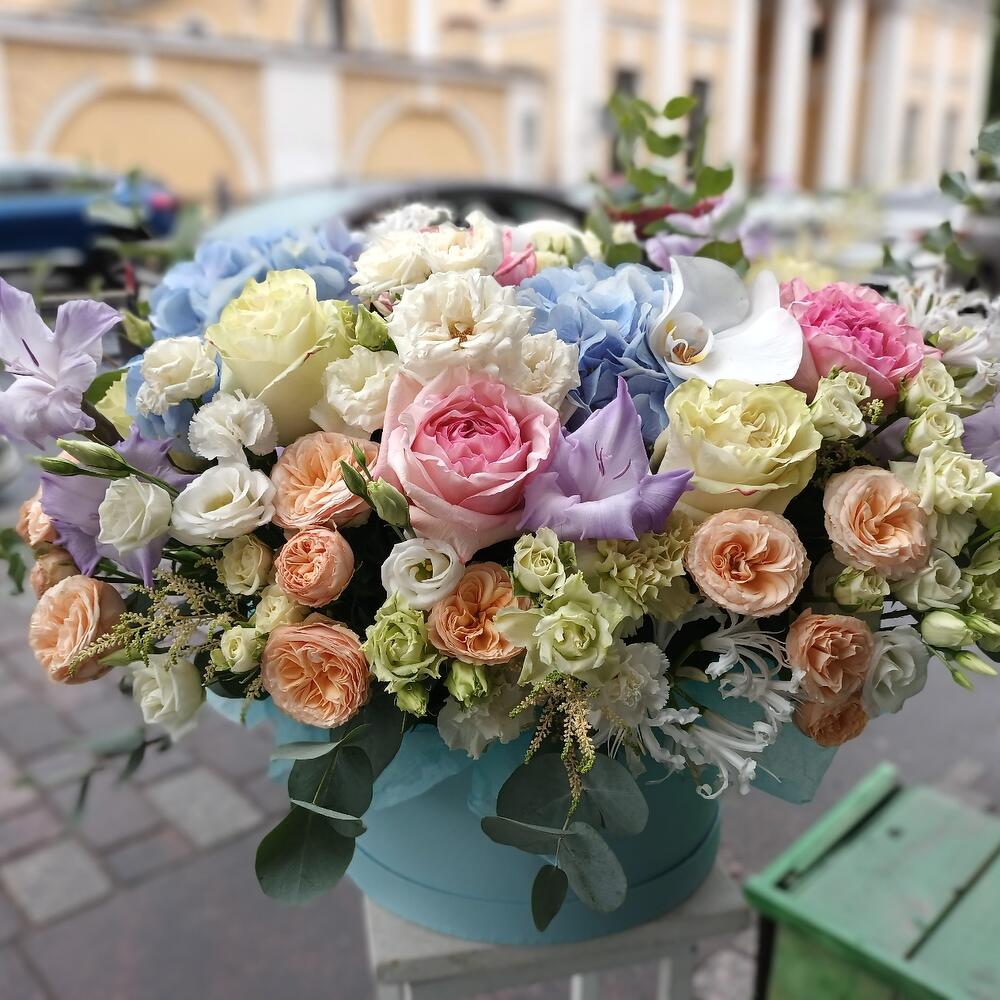 Коробка шляпная – 1 шт.Калька упаковка – 4 шт.оазис флористический кирпич – 2 шт.гортензии – 3 шт.Эвкалипт – 10 шт.Лизиантус – 5 шт.Астильба – 5 шт.Гладиолус – 3 шт.розы кустовые пионовидные – 7 шт.розы кустовые – 10 шт.Нерина – 5 шт.розы пионовидные – 7 шт.орхидея – 3 шт.Диантус кустовой – 7 шт.