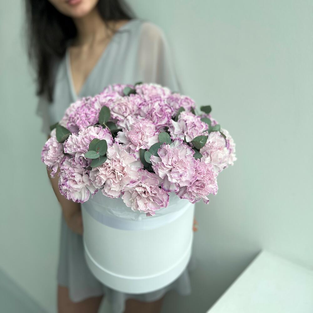 Шляпная коробка с фиолетовой гвоздикой и эвкалиптом, 25 см в диаметре и 35 см высотой