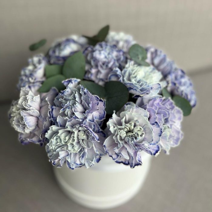 Шляпная коробка с лавандовой гвоздикой с эвкалиптом, небольшого размера, 20 см в диаметре и 25 см высотой