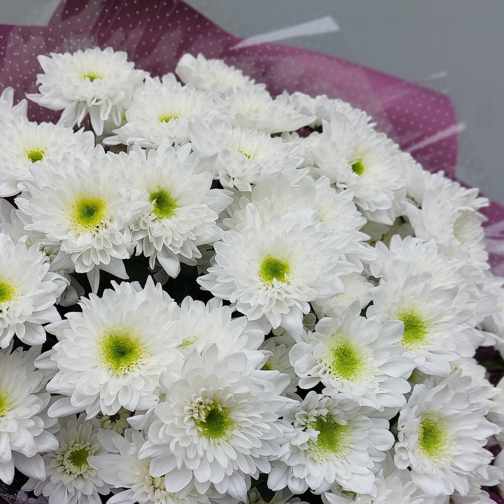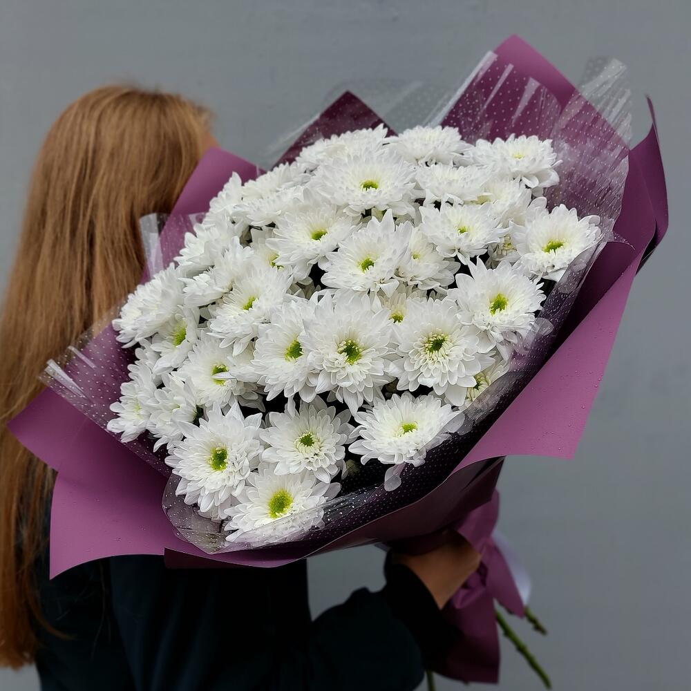 Хризантема кустовая белая – 11 шт.Упаковка дизайнерская – 2 шт.Лента атласная – 1 шт.