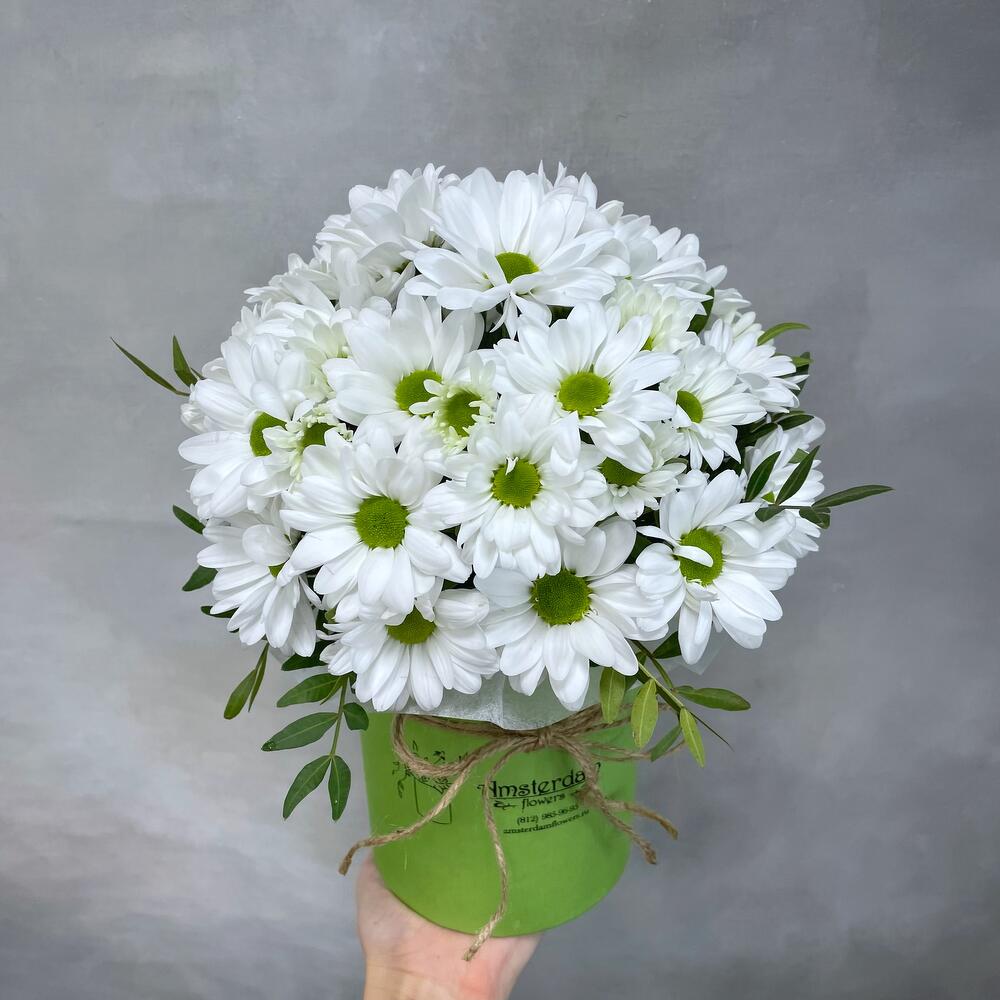 Хризантема Кустовая Бакарди белая – 5 шт.Коробка d12 – 1 шт.Зелень – 1 шт.