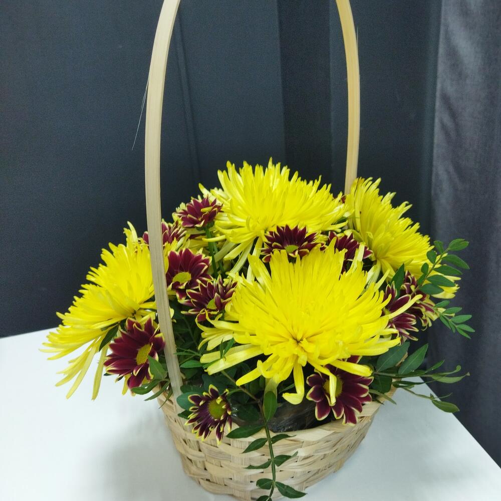 Хризантема кустовая – 2 шт.Хризантема – 5 шт.Фисташка – 1 шт.Корзина плетеная – 1 шт.