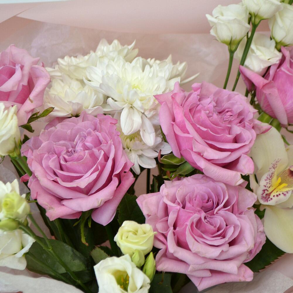 Лизиантус – 3 шт.Хризантема кустовая – 1 шт.орхидея – 1 шт.Оригинальная упаковка – 1 шт.розы пионовидные – 5 шт.