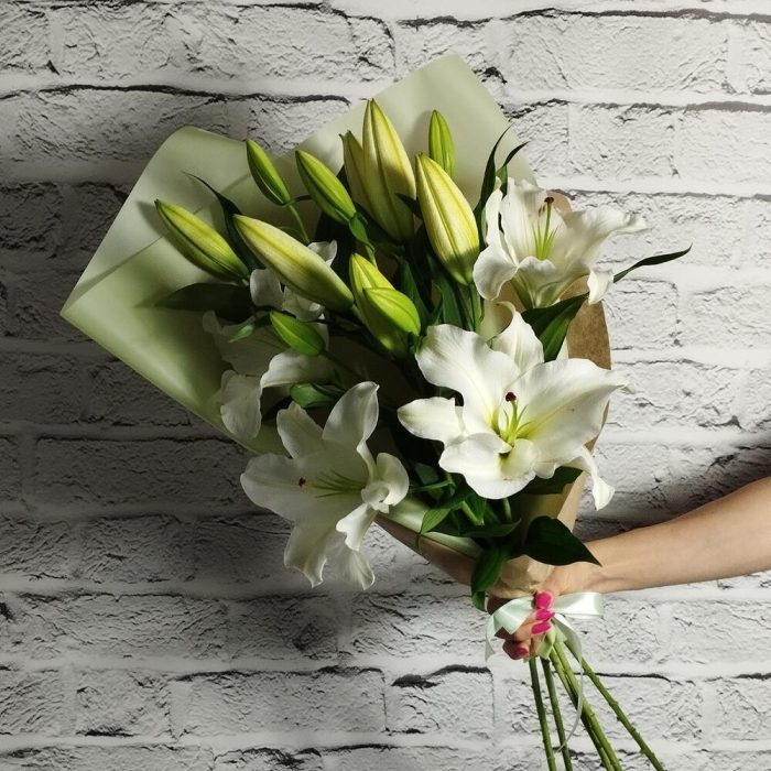 Упаковка – 1 шт.Лента атласная – 1 шт.Лилия белая – 5 шт.