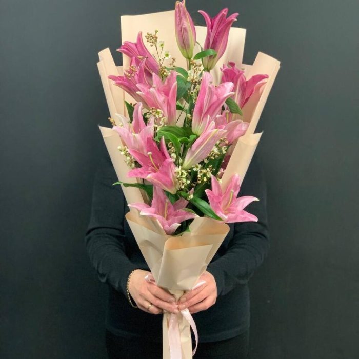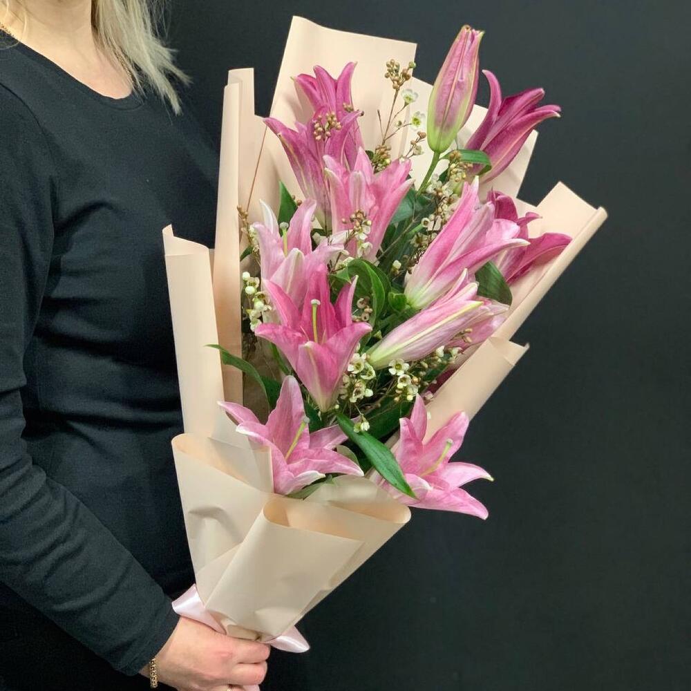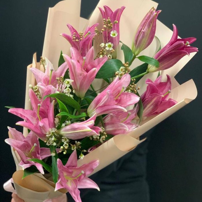 Лилия – 3 шт.Ваксфлауэр – 2 шт.Дизайнерская упаковка – 1 шт.Атласная лента – 1 шт.