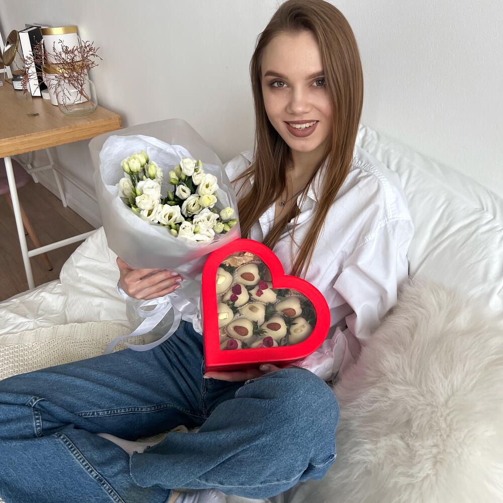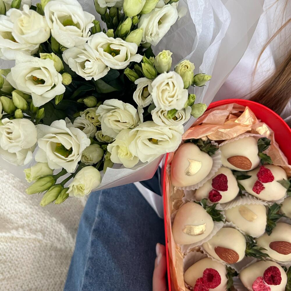 эустома белая – 5 шт.клубника в бельгийском шоколаде – 12 шт.подарочный бокс сердце – 1 шт.