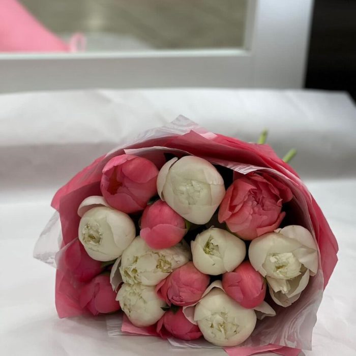 Пион Коралл Шарм (Coral Charm) – 8 шт.Упаковка – 2 шт.Лента атласная – 1 шт.Пион белый – 7 шт.