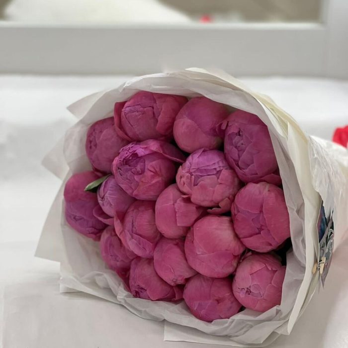 Упаковка – 2 шт.Лента атласная – 1 шт.пион ярко розовый премиум – 17 шт.