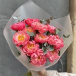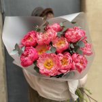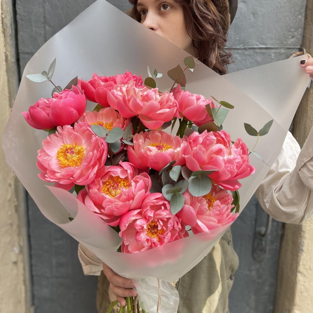 Большая охапка пионов корал шарм с эвкалиптом / 1366 id