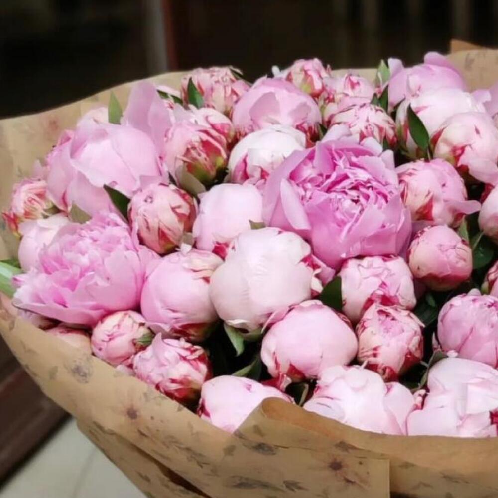 Пион розовый – 51 шт.Упаковка дизайнерская – 1 шт.Лента атласная – 2 шт.Открыточка с вашими пожеланиями – 1 шт.хорошее настроение – 100 шт.инструкция по уходу за цветами – 1 шт.коробка переноска – 1 шт.Кризал – 1 шт.