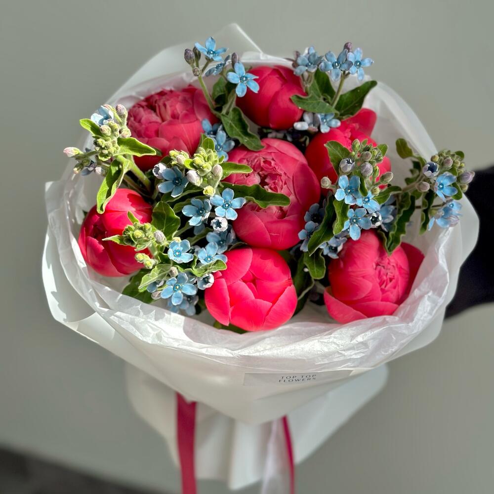 Пион – 7 шт.Оксипеталум – 6 шт.Упаковка дизайнерская – 1 шт.Средство продления жизни цветка – 1 шт.любовь флориста (бесплатно) – 100500 шт.