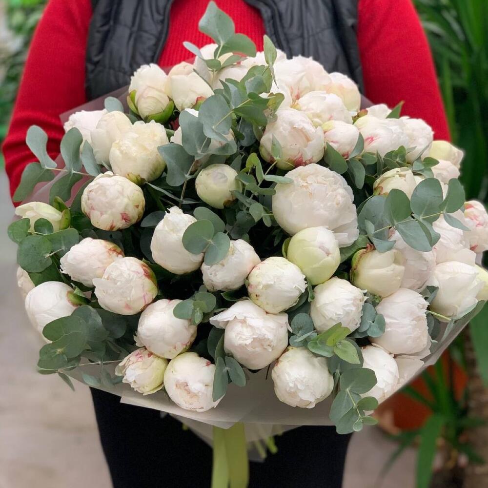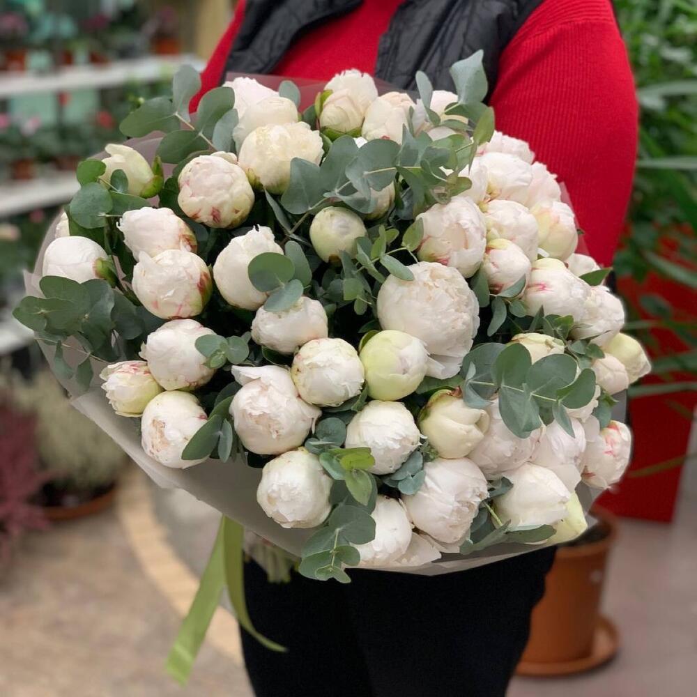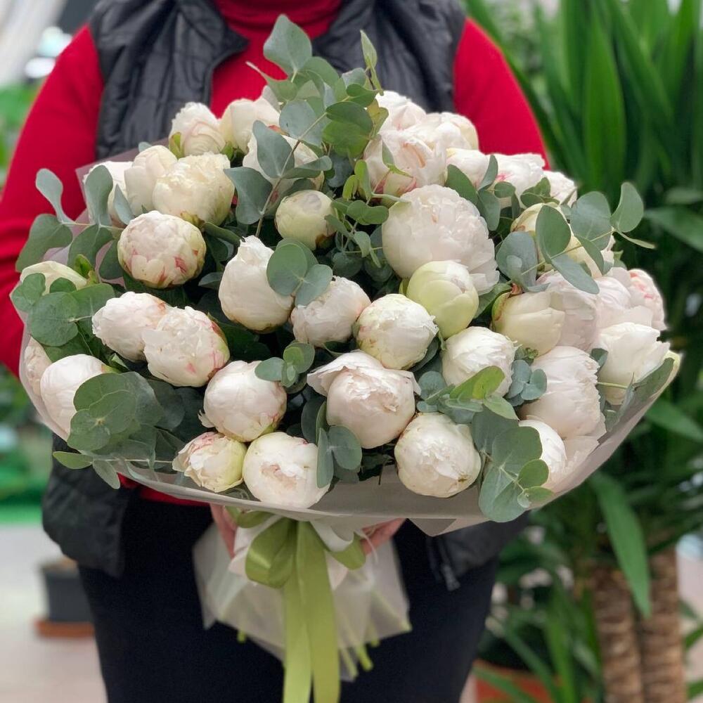 Шикарный букет пионов Сара бернар с эвкалиптом