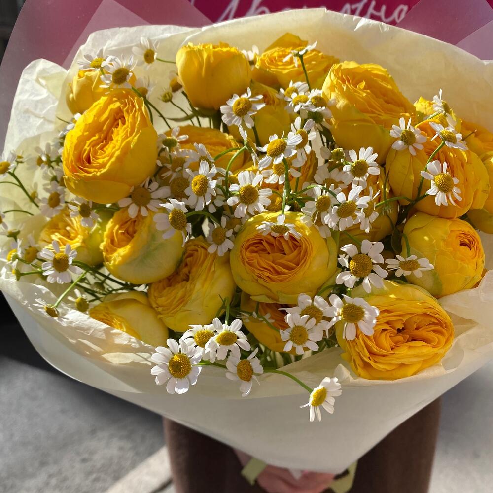 Букет солнечных роз с ромашкой