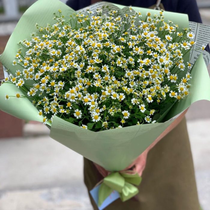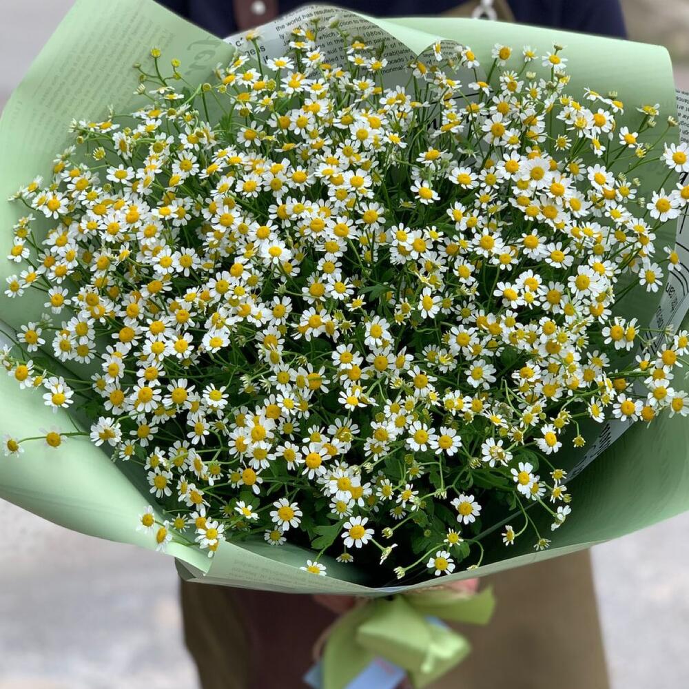 Матрикария (Ромашка Камила) – 19 шт.Упаковка дизайнерская – 1 шт.Лента атласная – 1 шт.