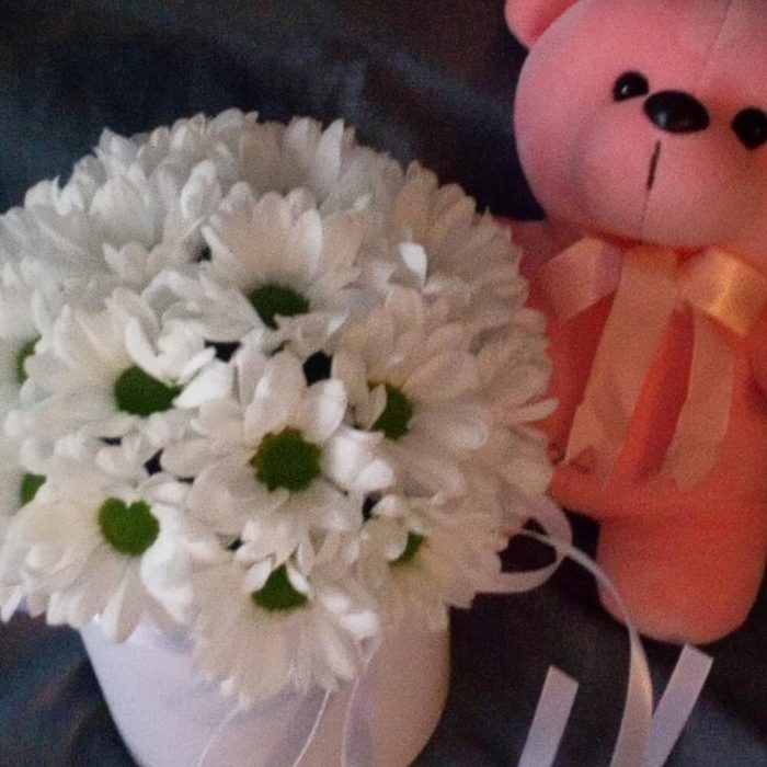 ромашки – 17 шт.Шляпная коробка – 1 шт.Пакет подарочный – 1 шт.Мишка плюшевый – 1 шт.Флористическая губка – 1 шт.