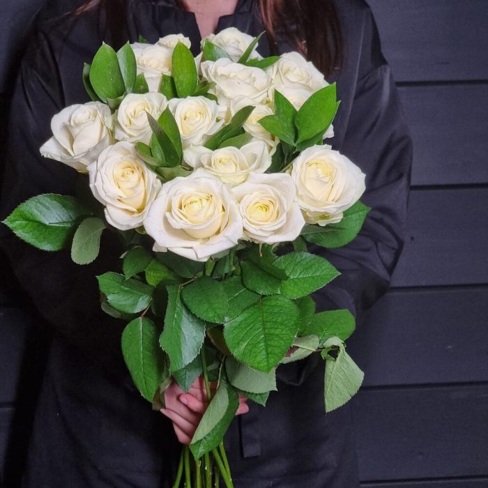 Роза аваланж россия – 15 шт.Рускус сочи – 3 шт.Пленка прозрачная – 1 шт.Лента атласная – 1 шт.