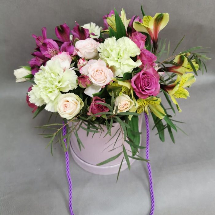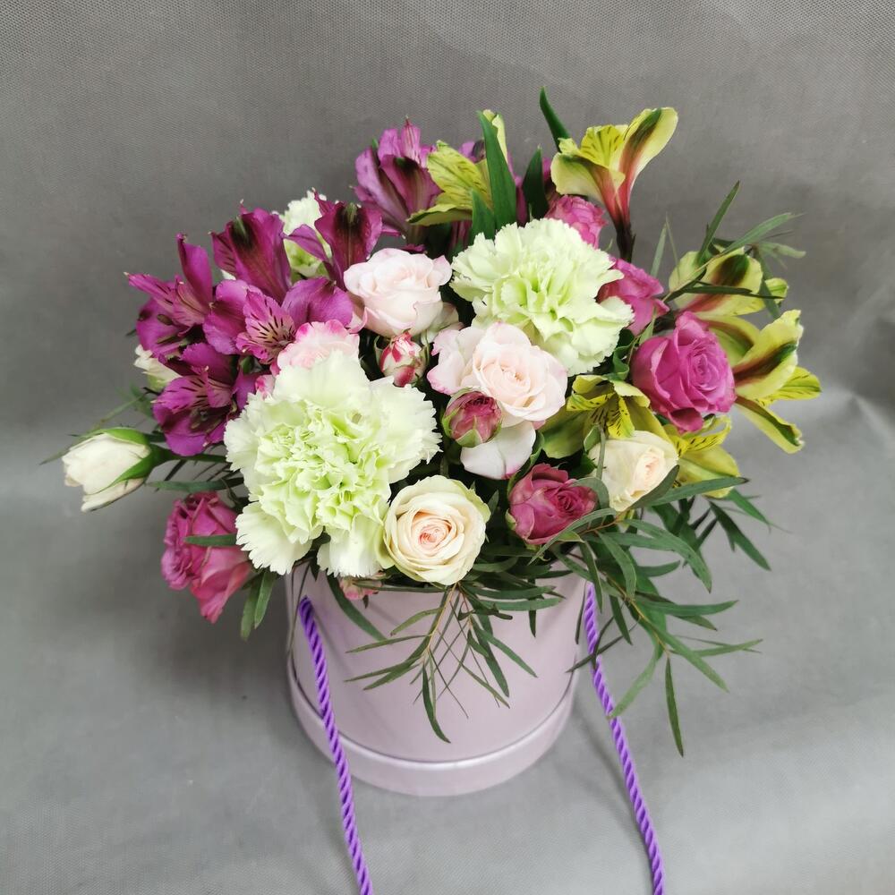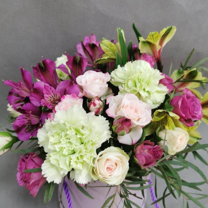 Альстромерии, Гвоздики, Кустовые розы, Лизиантусы, Розы, Хризантемы