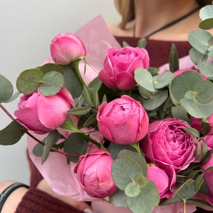 Эвкалипт – 1 шт.Тишью – 1 шт.Роза кустовая пионовидная – 3 шт.Оазис флористический – 1 шт.коробка шляпная 12х15 – 1 шт.