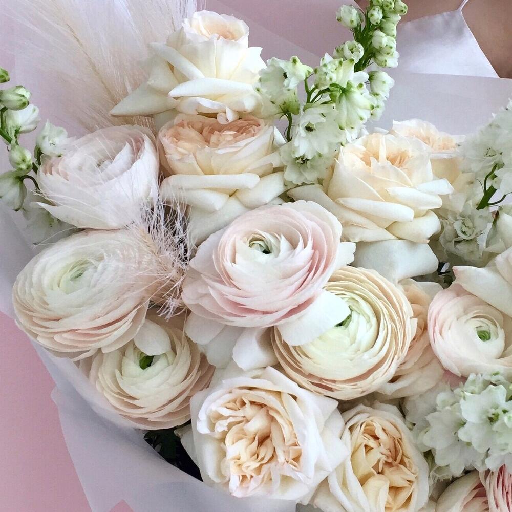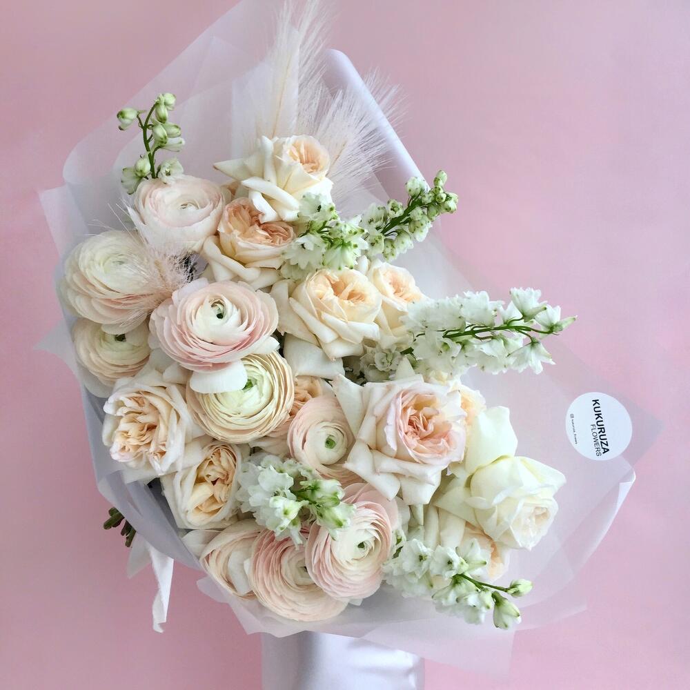 Ранункулюс клуни ханой – 9 шт.пионовидная роза white o’hara – 10 шт.Дельфиниум – 6 шт.сухоцвет паникум – 1 шт.Пленка матовая – 3 шт.Лента атласная – 1 шт.