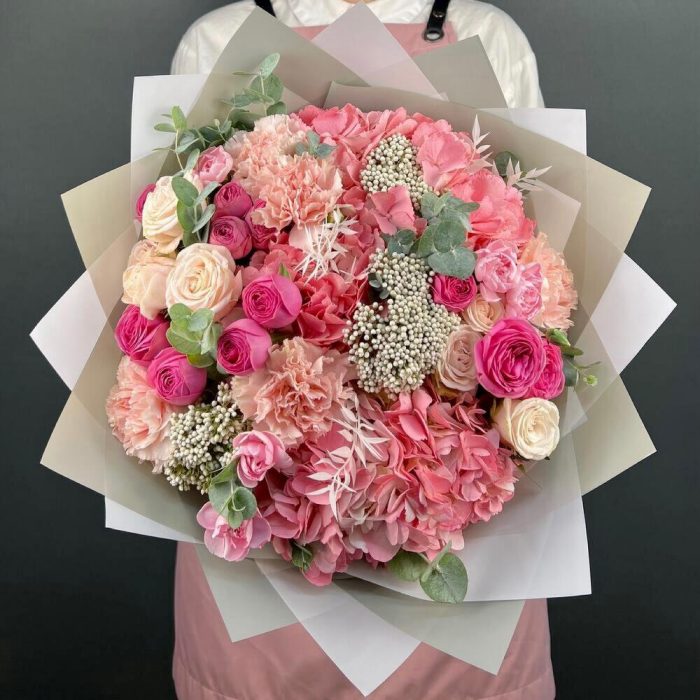 Авторский букет из розовых Гортензий и кустовых пионовидны Роз