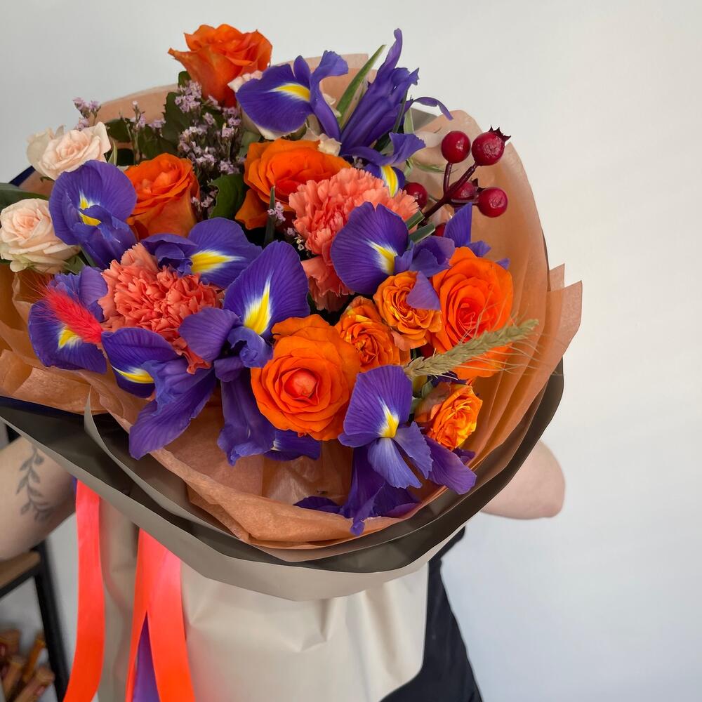 Ирис – 5 шт.Диантус – 2 шт.Кустовая роза – 3 шт.Роза – 5 шт.Ягоды декоративные – 1 шт.Пшеница (сухоцвет) – 1 шт.Лимониум – 1 шт.Салал пучок – 1 шт.Тишью – 2 шт.Пленка матовая – 2 шт.Лента атласная – 2 шт.