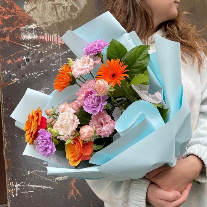 гербера мохровая – 2 шт.Диантус – 3 шт.Салал – 2 шт.Роза оранжевая – 2 шт.Роза пионовидная кустовая – 1 шт.Лизиантус – 1 шт.Упаковка дизайнерская – 3 шт.