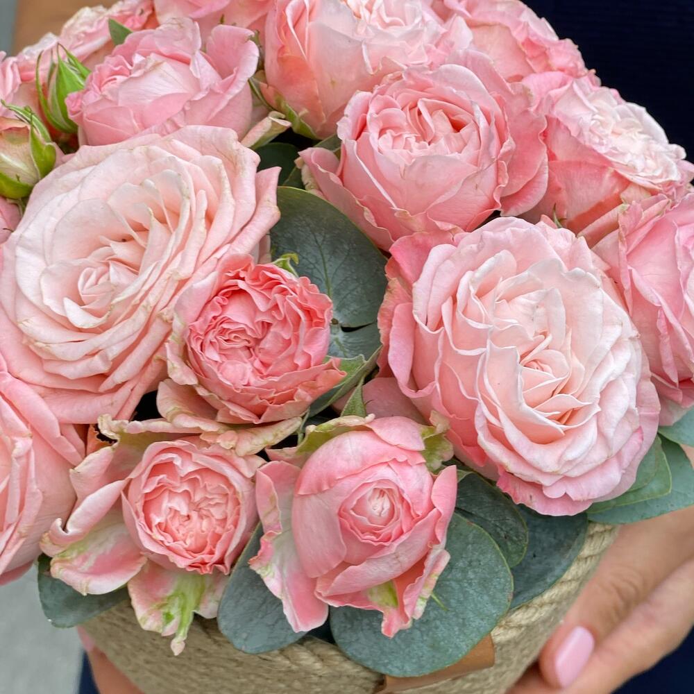 Эвкалипт пучок – 1 шт.Оазис флористический – 1 шт.роза кустовая сорта мадам бомбастик – 5 шт.кашпо джутовое ручной работы – 1 шт.
