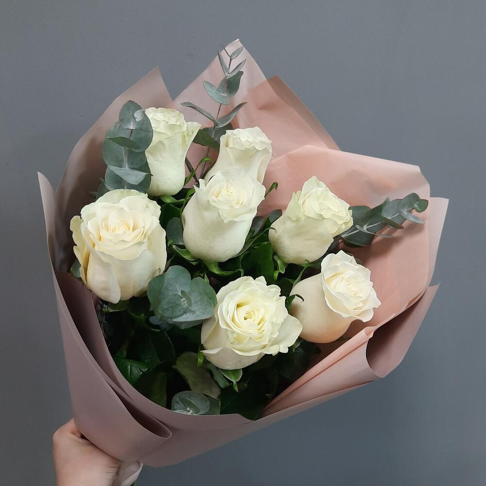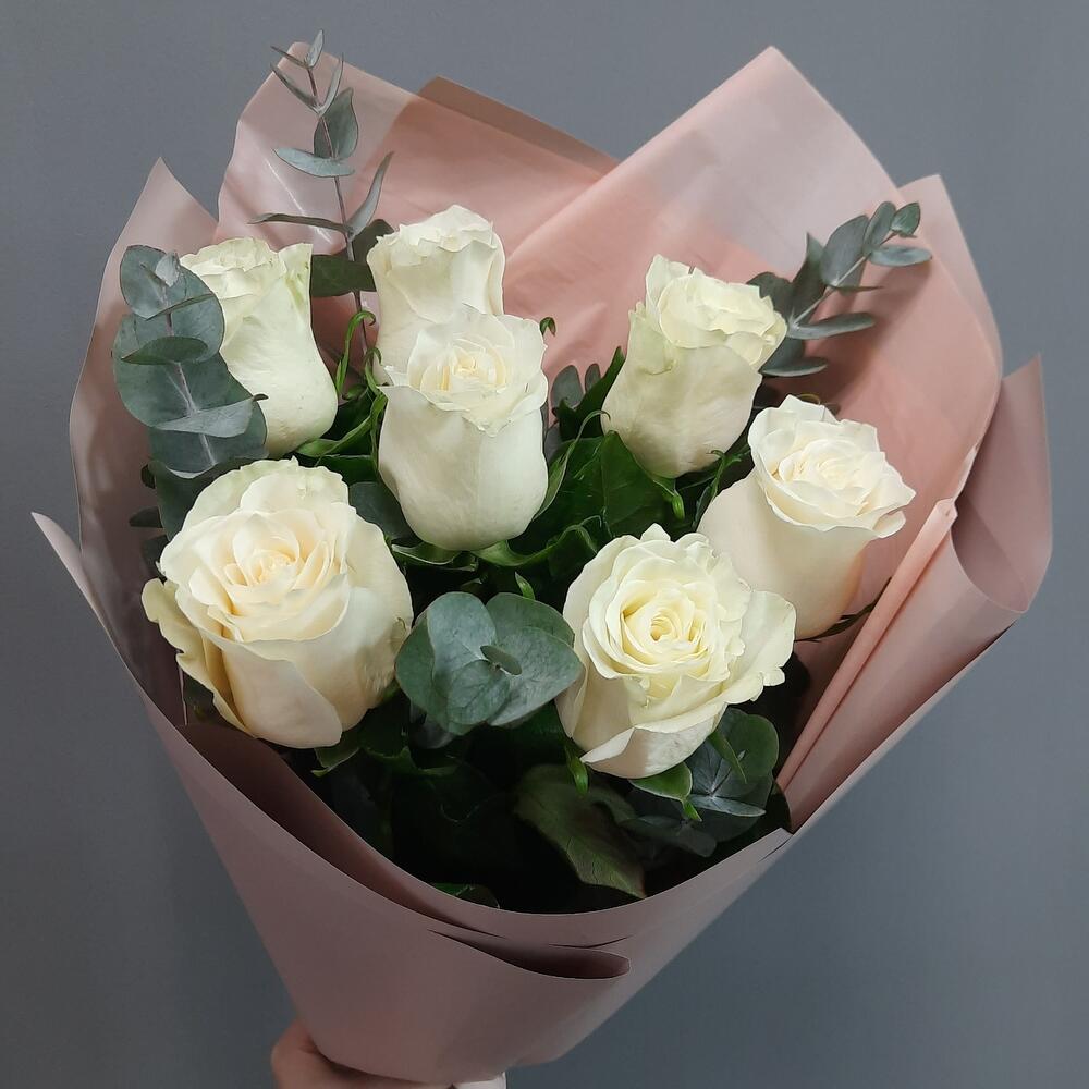 Роза mondial – 7 шт.Эвкалипт – 4 шт.Упаковка дизайнерская – 2 шт.