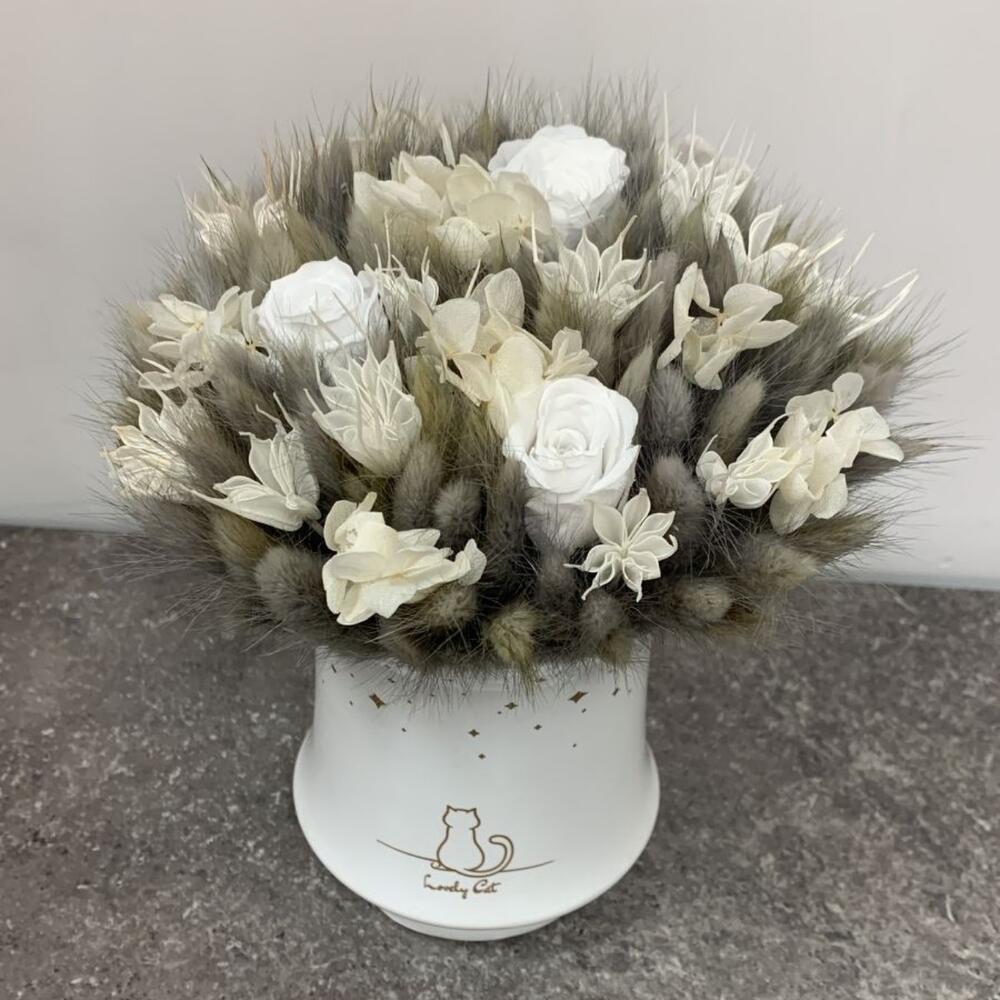 Кашпо керамическое – 1 шт.Роза стабилизированная – 3 шт.гортензия стабилизированная – 1 шт.лагурус пучок – 2 шт.Нигелла сухоцвет – 15 шт.