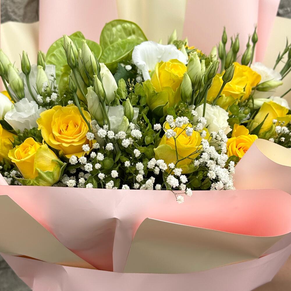 Альстромерии, Кустовые розы, Лизиантусы, Пионовидные розы, Розы, Ромашки