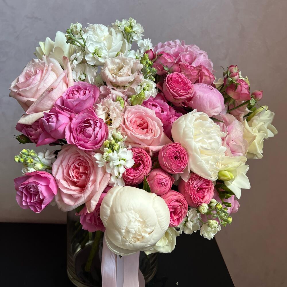 Гортензия – 2 шт.Пионовидная кустовая роза – 3 шт.Лизиантус (эустома) – 2 шт.Пион – 5 шт.Пионовидная одноголовая роза – 3 шт.Одноголовая роза – 3 шт.Фрезия – 3 шт.Маттиола – 6 шт.Кустовая роза – 2 шт.Атласная лента – 2 шт.