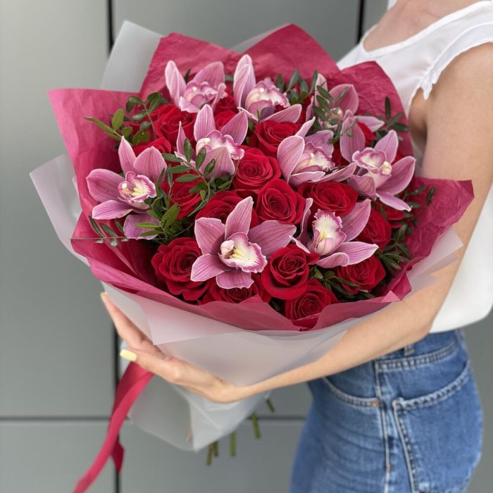 Букет из красных роз, цветков орхидеи и зелени в стильном оформлении!