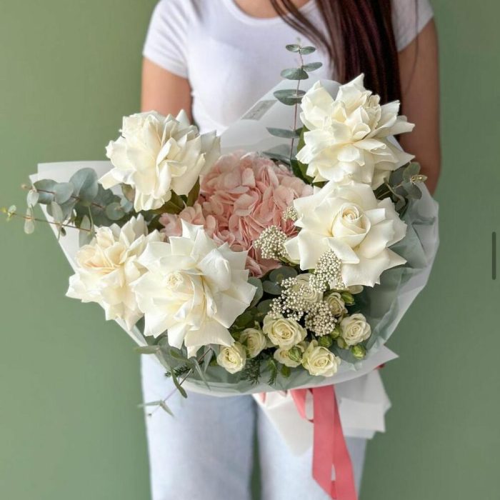 Букет “Chloe” из роз, гортензии и спрей роз