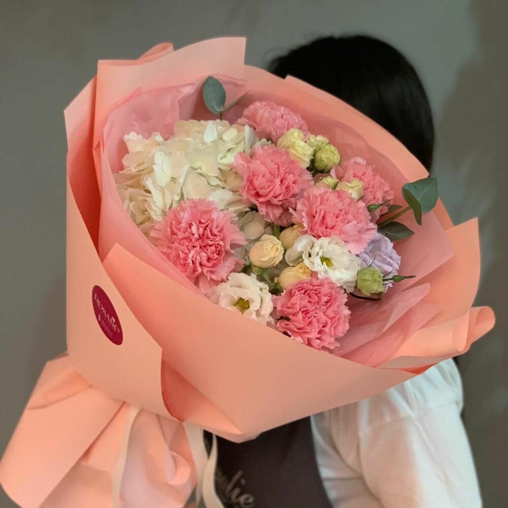 Альстромерии, Гвоздики, Кустовые розы, Лизиантусы, Розы, Хризантемы