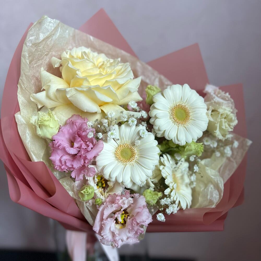 Лизиантус (эустома) – 2 шт.Одноголовая роза – 1 шт.Гербера – 3 шт.Гипсофила – 1 шт.декоративная упаковка – 1 шт.Атласная лента – 1 шт.