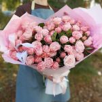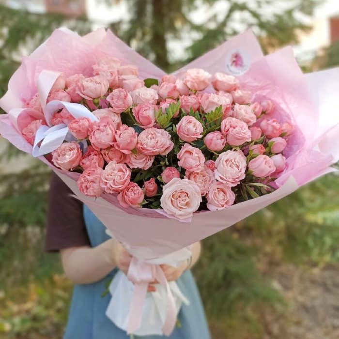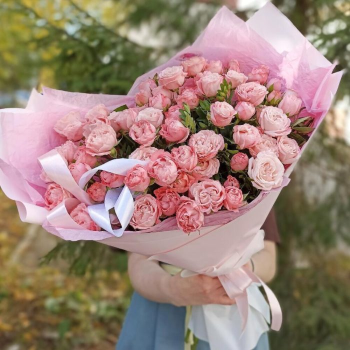 кустовые пионовидные розы – 25 шт. Эвкалипт – 5 шт. Дизайнерская упаковка – 2 шт. Открыточка с вашими пожеланиями – 1 шт.