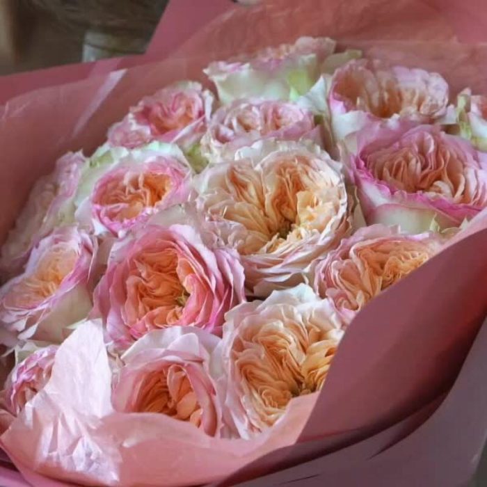 Букет из 15 персиковых пионовидных роз Flash Back 40 см в упаковке